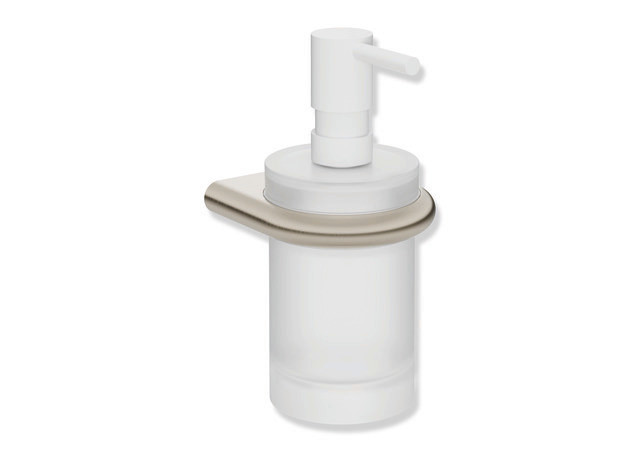 zur Aufnahme handelsüblicher Flüssigseife, Desinfektionsmittel und -gele, ringförmiger Wandhalter aus hochwertigem Edelstahl, mit Schutzring aus Kunststoff für eine sichere, definierte Position und gegen Beschädigung des Glaseinsatzes, Seifenspender aus hochwertigem, satiniertem Kristallglas, Füllmenge ca. 200 ml, zur Wandmontage, verdeckte Befestigung, 85 mm breit, 168 mm hoch und 92 mm tief, mit korrosionsfreiem HEWI Befestigungsmaterial