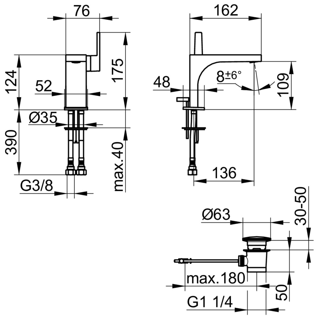 Auslaufhöhe 109 mm, Einlochmontage mit Schnell-Montage-System, Anschlussart Anschlussschläuche G 3/8, Mischwasserkartusche mit keramischen Dichtscheiben, Strahlregler M 24 x 1, Strahlwinkel +/-6° verstellbar, Durchflussmenge begrenzt auf 7,6 l/min, für Durchlauferhitzer geeignet, geräuschgeprüft