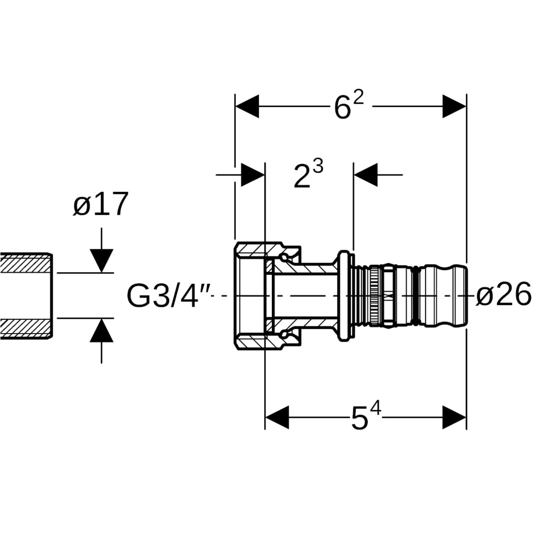 Geberit Anschluss Mepla Ø 26 mm x G 3/4, mit Überwurfmutter, vernickelt, Messing