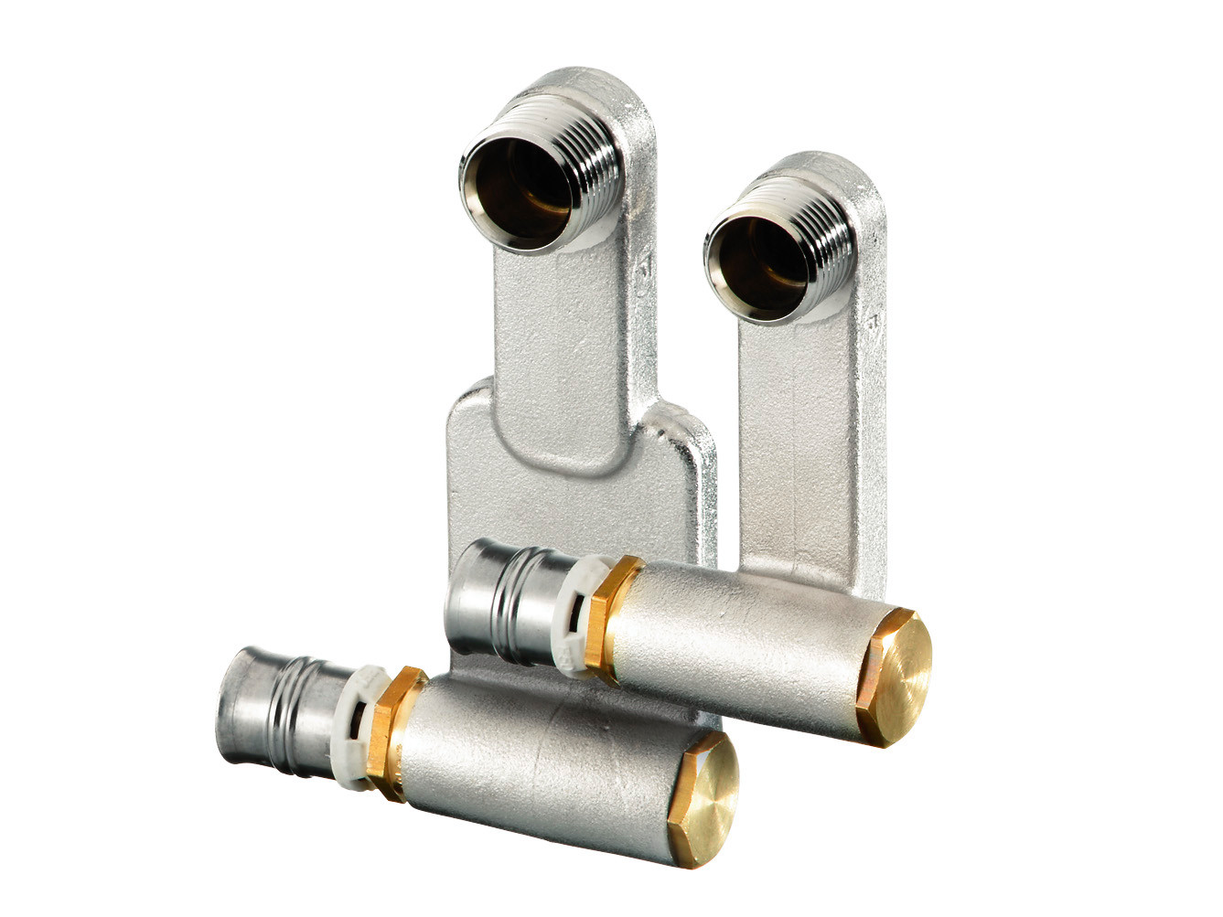 für den Anschluss von Heizkörpern aus der Sockelleiste, mit weißen Fixierringen mit integrierten Sichtfenstern, fixierten Edelstahlpresshülsen und Leckagefunktion