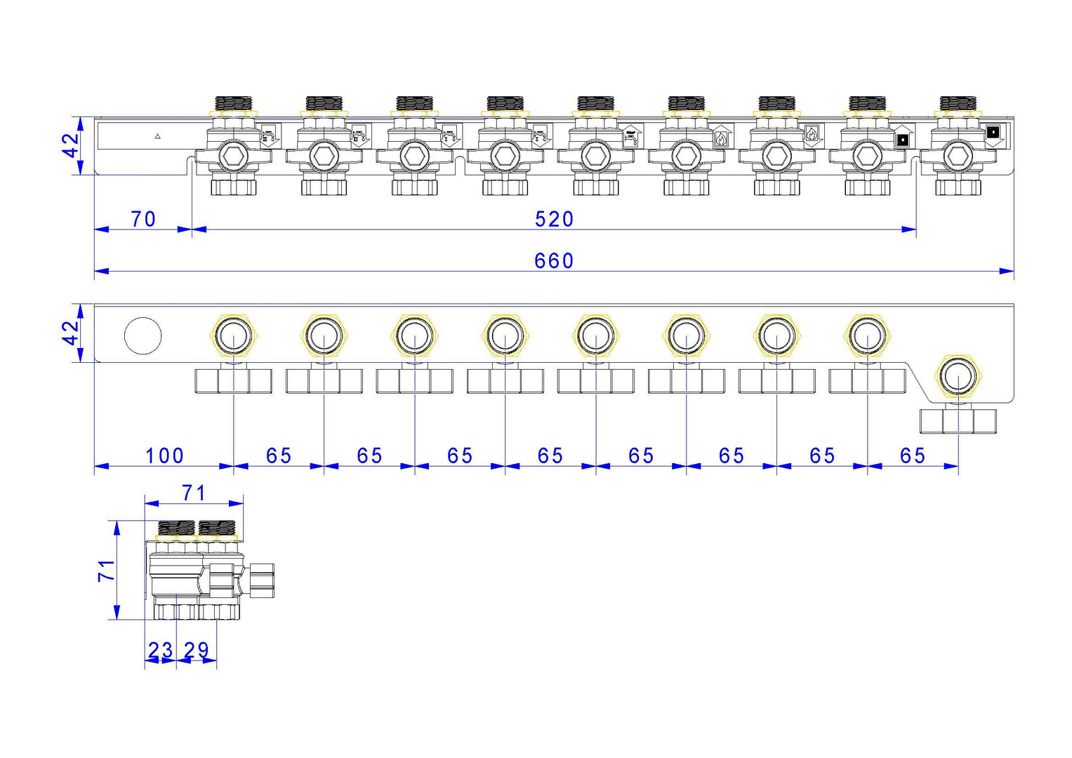 strawa Friwara WM-AS10-1-KH9-ZB-TWK-TWW-VKH Anschlussschiene für Hydraulikmodul TWE-HT-HY-(BY), TWE-FB-HY-(BY), mit Zweitbadanschluss Trinkwasser kalt + warm, mit Kugelhahnset für externen Verteiler, 5x Trinkwasser und 4x Heizung BxHxT: 660 x 71 x 93 mm