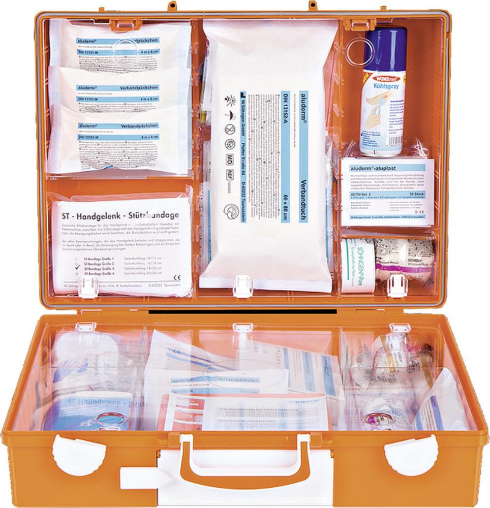 Inhalt: gemäß DIN 13157 plus individuelle berufsrisikobezogene Erweiterung, mit integriertem Pflasterspender für sofortige, DIN-unabhängige Wundversorgung