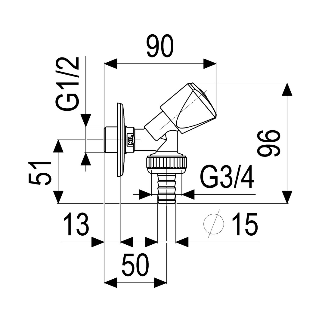 Geräteschrägsitventil 1/2" x 3/4", mit Dreikantgriff, verchromt.