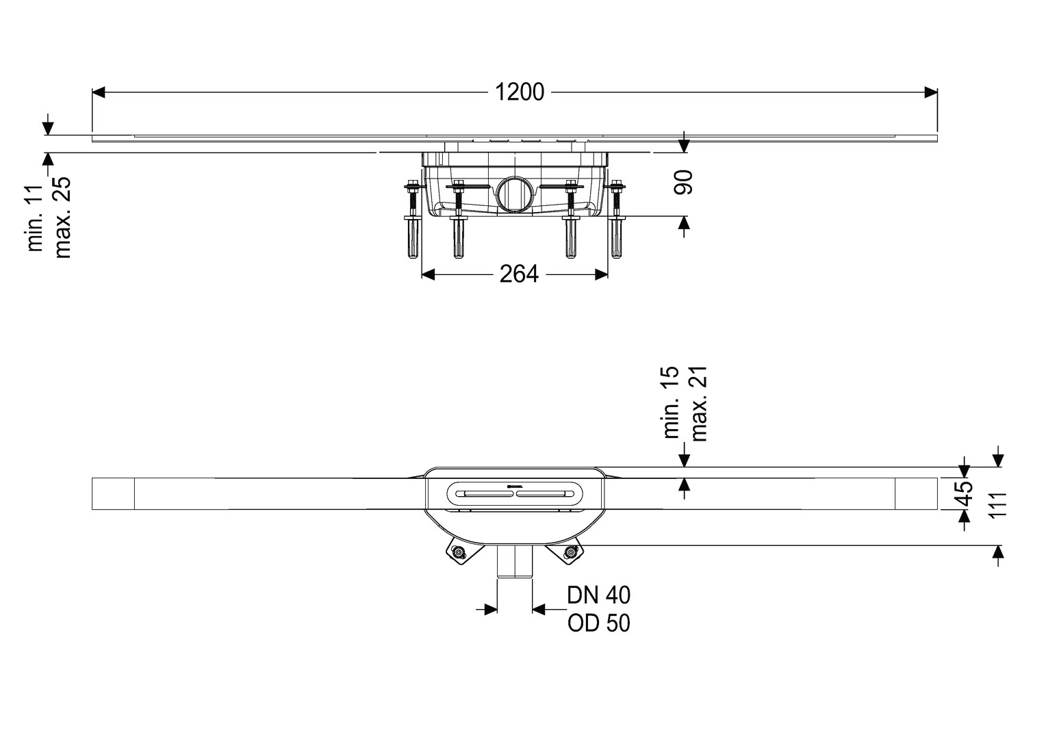 Geruchsverschluss mit 50 mm Wasservorlage, mit Rinnenprofil aus Edelstahl V4A, Grundkörper aus PP, min. Bauhöhe 90 mm, Auslauf seitlich DN 50, für Belaghöhe von 11-25 mm, werkseitig angebrachte Dichtmanschette nach DIN EN 1253-1 und DIN 18534-1-W3-I, Abdeckung Rinnenprofil aus Edelstahl V4A, Klasse K 3, Sperrwasserhöhe 50 mm, Abflussleistung 0,8 l/s/0,6 l/s bei Anstau 20/10 mm, mit Schall- und Setzungsdämpfer