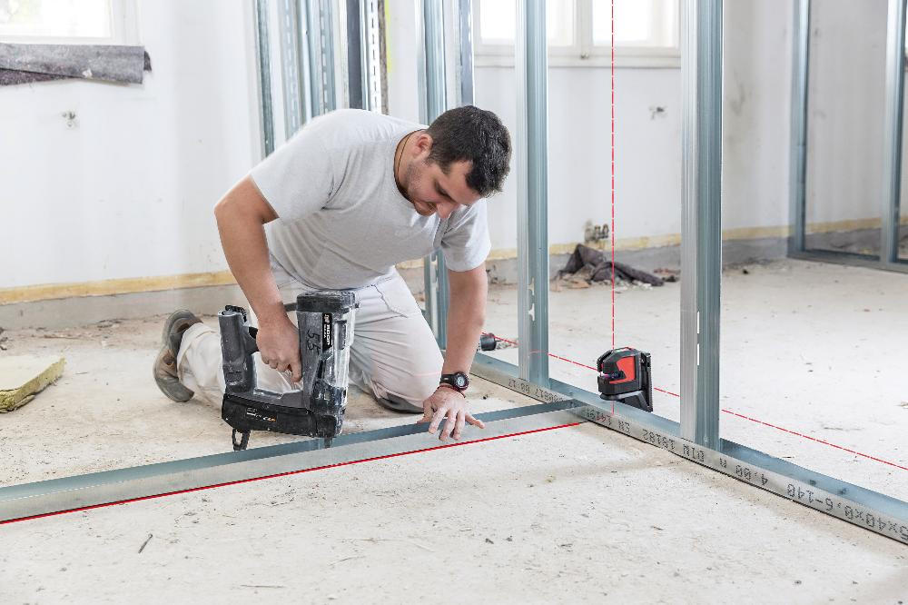 • Ideal für Ausrichtungsarbeiten (z. B. Fliesenlegen, Trockenbau, Trennwände und Elektroinstallationen) sowie Lotpunktprojektionen und das Abstecken oder Übertragen von gemessenen Punkten