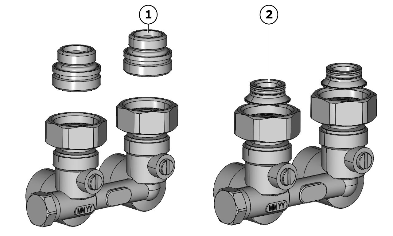 voreinstellbare Absperrverschraubung, für Kompaktheizkörper mit einem eingebauten Thermostateinsatz und mit einem Mittenabstand von 50 mm, die Verschraubung verfügt über einen einstellbaren Bypass, außerdem verfügt der Anschlussblock über Absperrkugelhähne für Vor- und Rücklauf die mit einem Schraubenzieher betätigt werden können, Eck-Ausführung für Wandanschluss, Durchgang-Ausführung für Bodenanschluss, Anschluss an Heizkörper mit folgenden Schnittstellen: direkt ohne Adapter an Heizkörper mit G 3/4"-Außengewinde und Flachdichtung, für Heizkörper mit G 3/4-Euroconus-Anschluss gemäß EN 16313 über den Euroconus-Adapter mit Flachdichtung, für Heizkörper mit G 11/2-Innengewinde über den Reduziernippel von G 3/4 auf G 1/2, auf der Rohrseite ist die Heizkörperverschraubung mit einer G 3(4-Euroconus-Verbindungsstelle gemäß EN 16313 ausgestattet, Durchflussrichtung beliebig, Durchflusskennlinien gelten für beide Strömungsrichtungen, Ventilkörper aus vernickeltem Messing, Medium Wasser oder Wasser-Glykol-Gemisch gemäß VDI-Richtlinie 2035, Absperrkugel/Heizkörperanschluss und Überwurfmutter aus Messing, Kugelabdichtung aus PTFE, O-Ringe aus PDM70, Bypass-Einstellschraube und Schutzkappe aus Messing, Abdichtung aus Faserstoff, Mediumstemperatur -10 bis 130 °C, stat. Druck PN 10, Rohranschluss Außengewinde, Heizkörperanschluss G 3/3, Einbauort Vorlauf und Rücklauf, Anschlussgewinde 3/4", Nennweite DN 15, Kvs-Wert 2,4, Einstellbegrenzung ja, Voreinstellung ja, Befüllen/Entleeren nein, Mess-Möglichkeit nein