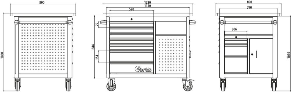 Gesamtmaße verstehen sich inklusive Arbeitsplatte und Laufrollen.