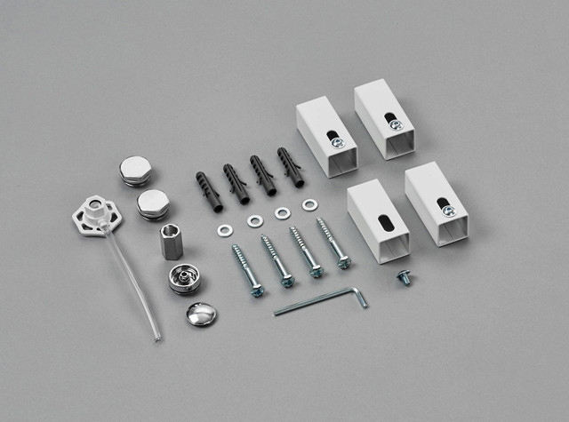 für Quaro, 4 Wandhülsen (60 mm), 4 Innensechskantschrauben 4 x 20 mm, 4 Kunststoffdübel 8 x 40 mm, 4 Sechskantschrauben mit Schlitz 6 x 80 mm, verzinkt, 4 Unterlegscheiben verzinkt, 1 Innensechskant Schlüssel SW 3 mm, 1 Design-Entlüftungsventil 1/2", 2 Blindstopfen 1/2", verchromt, 1 Entlüftungsschlüssel, Montageanleitung