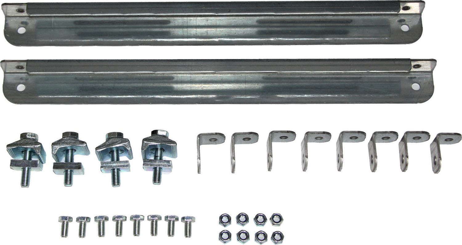 mit Neigungsausgleich, zur Befestigung an einem Stahlträger mit einer Flanschbreite von 100 mm bis 300 mm und einer Flanschdicke von 6 mm bis 21 mm, bestehend aus 2 Stück Trageschienen, 4x Spannpratzen, 4x Neigungsausgleich, Schrauben und Muttern (nur in Verbindung mit Befestigungskonsolen Werk-Nr. 65 00 638) Stahlblech, verzinkt