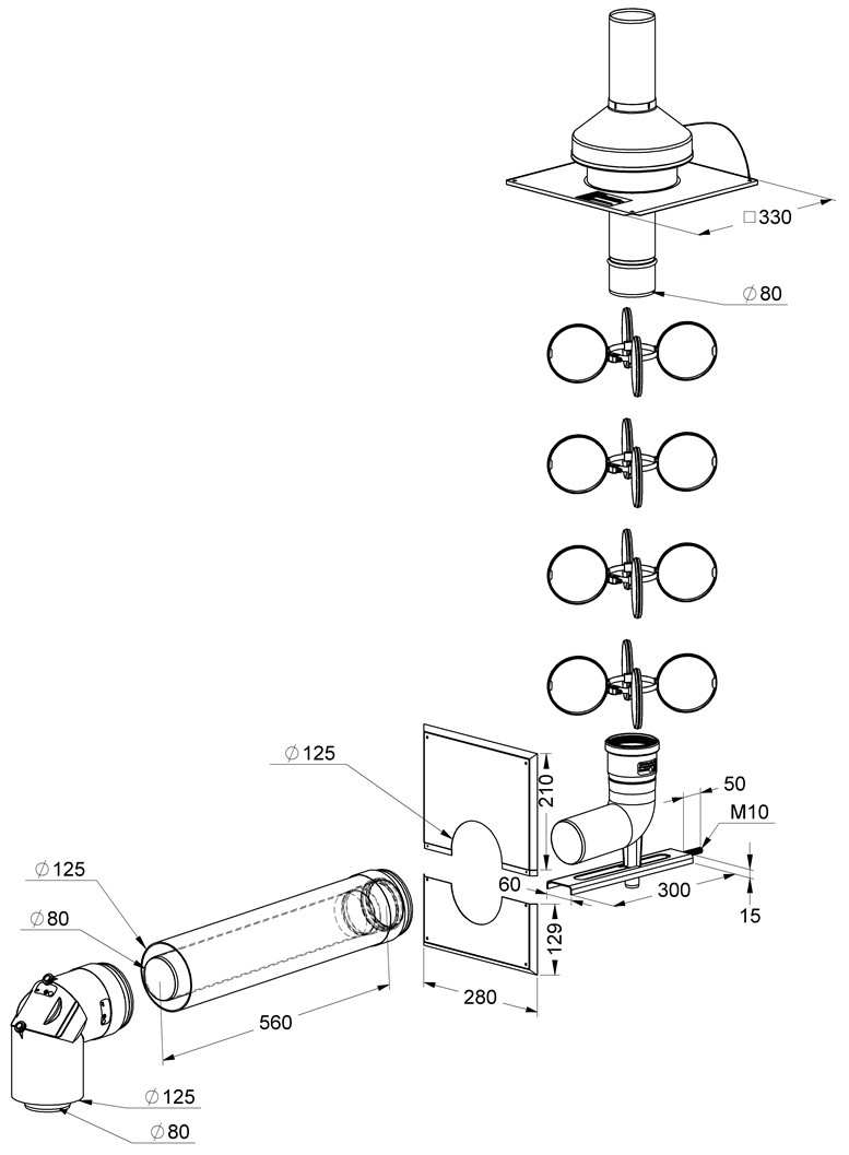 mit Verbindungleitung mit Mündung aus Edelstahl, bestehend aus: 87°-Kontroll-Bogen, Rohr 500 mm, Wandblende geschlossen, Schachteinführung mit Auflager, 4x Abstandhalter, Mündungs-Set Edelstahl 330 x 330 mm, mit Befestigung, bei Montagen mit flexiblem Rohr ist zusätzlich eine Kupplung notwendig