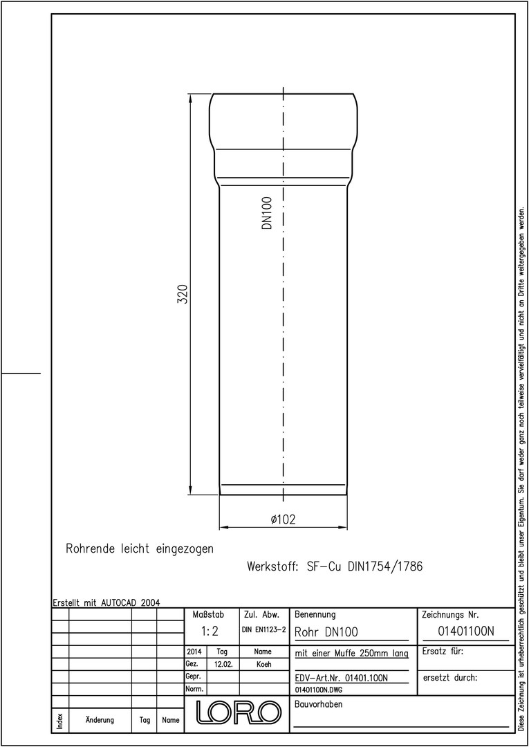 LORO N Regenfallrohr DN 100, 250 mm, 1 Muffe, rund, Kupfer