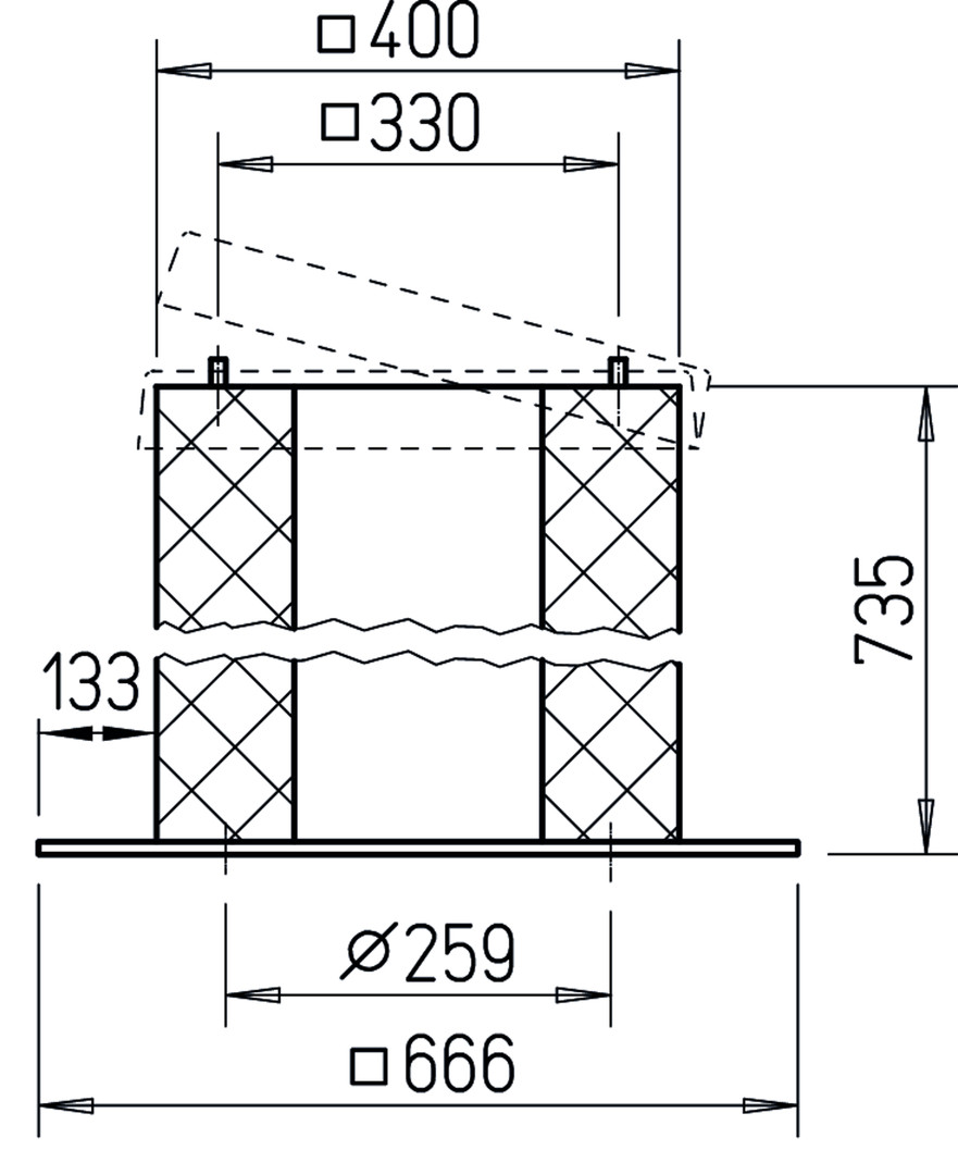 zur saugseitigen Geräuschdämpfung, alle Metallteile aus verzinktem Stahlblech, zur Montage auf Flachdächern in gleicher Weise wie ein Flachdachsockel