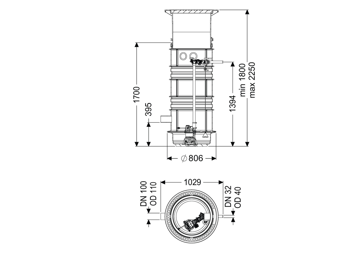 mit pneumatischer Niveauerfassung, zum Einbau ins Erdreich für Schmutz- und Regenwasser, Schachtsystem LW 600 aus PE-LLD, Pumpe mit Freistromrad, Einbau beständig bei Einbau ins Grundwasser bis 2500 mm, Pumpstation Aquapump im Schachtsystem LW 600, Zulauf DN 100 (GTF 600), Zulauf DN 150 (GTF 1200), Druckabgang DN 32 (OD 40) aus PVC, Abdeckung nach DIN EN 124 aus Beton/Guss, Klasse D, Kabellänge 10 m
