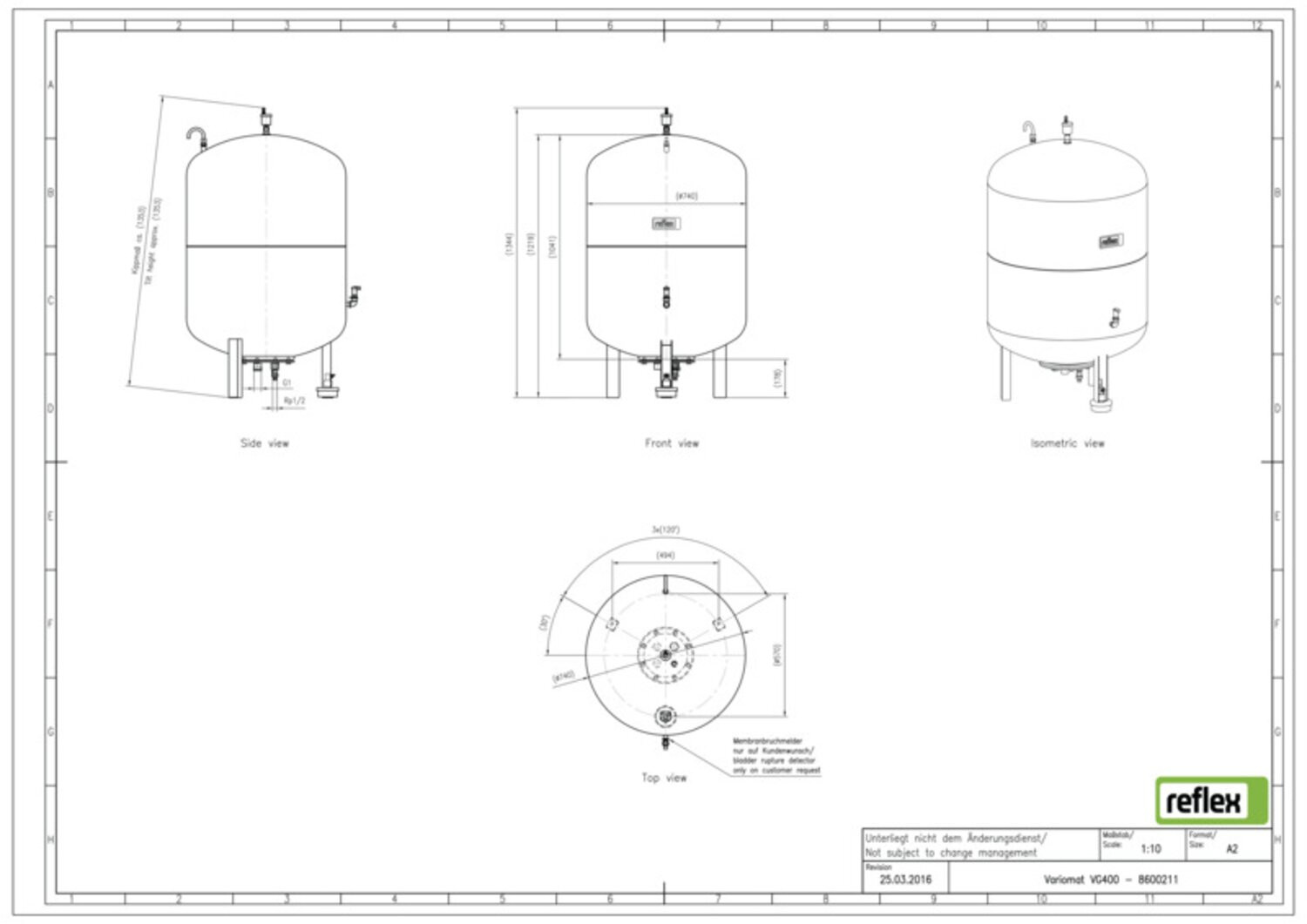austauschbare Vollmembran nach DIN EN 13831, Zulassung gemäß Richtlinie über Druckgeräte 2014/68/EU, zulässige Betriebstemperatur 70 °C, max. zulässige Systemtemperatur 120 °C