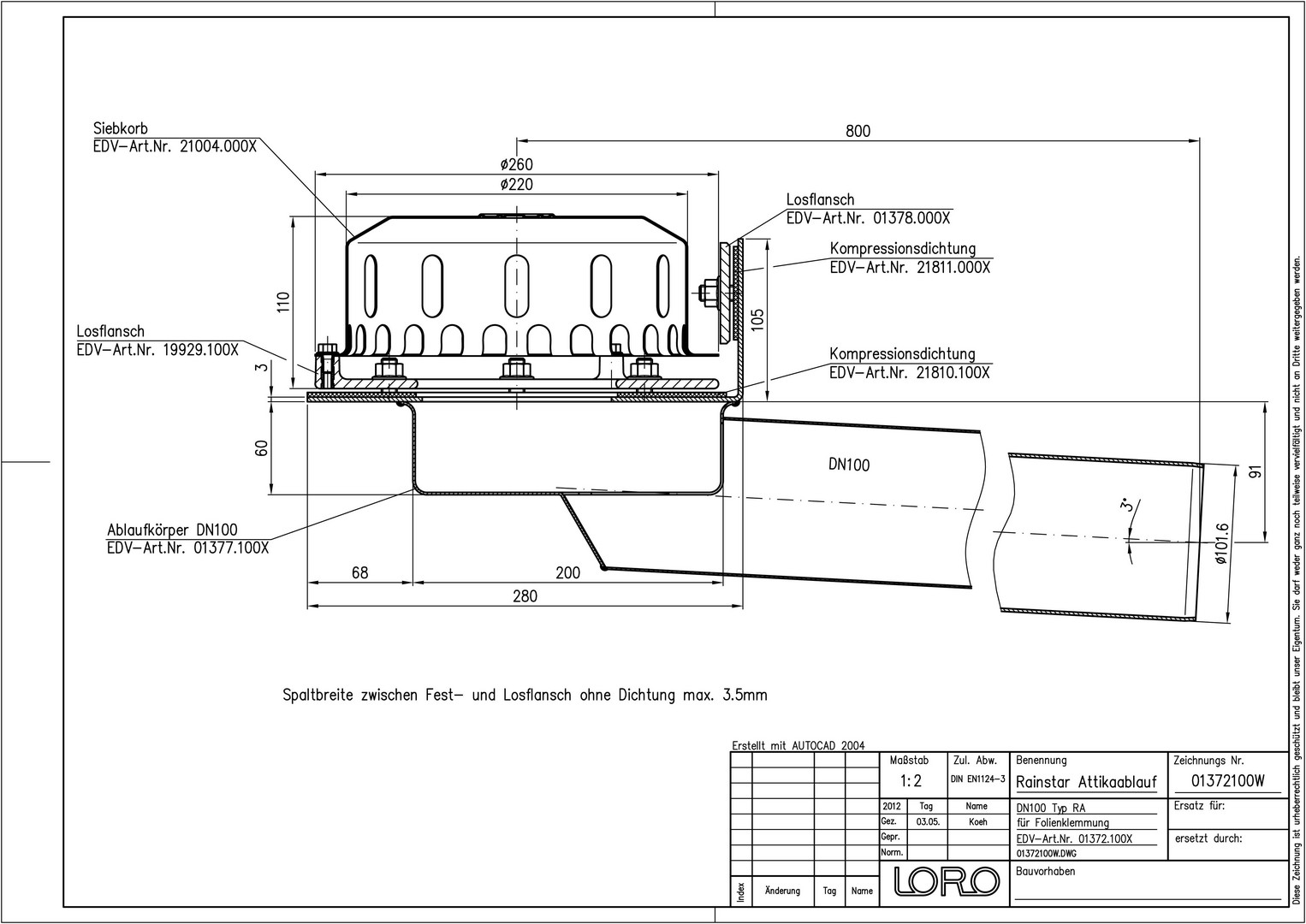LORO Attika Ablauf Rainstar Serie 79 (RA) Klemmflansch 90°, für Kunststoff-Dachabdichtungsbahnen, DN 100, Hauptentwässerung