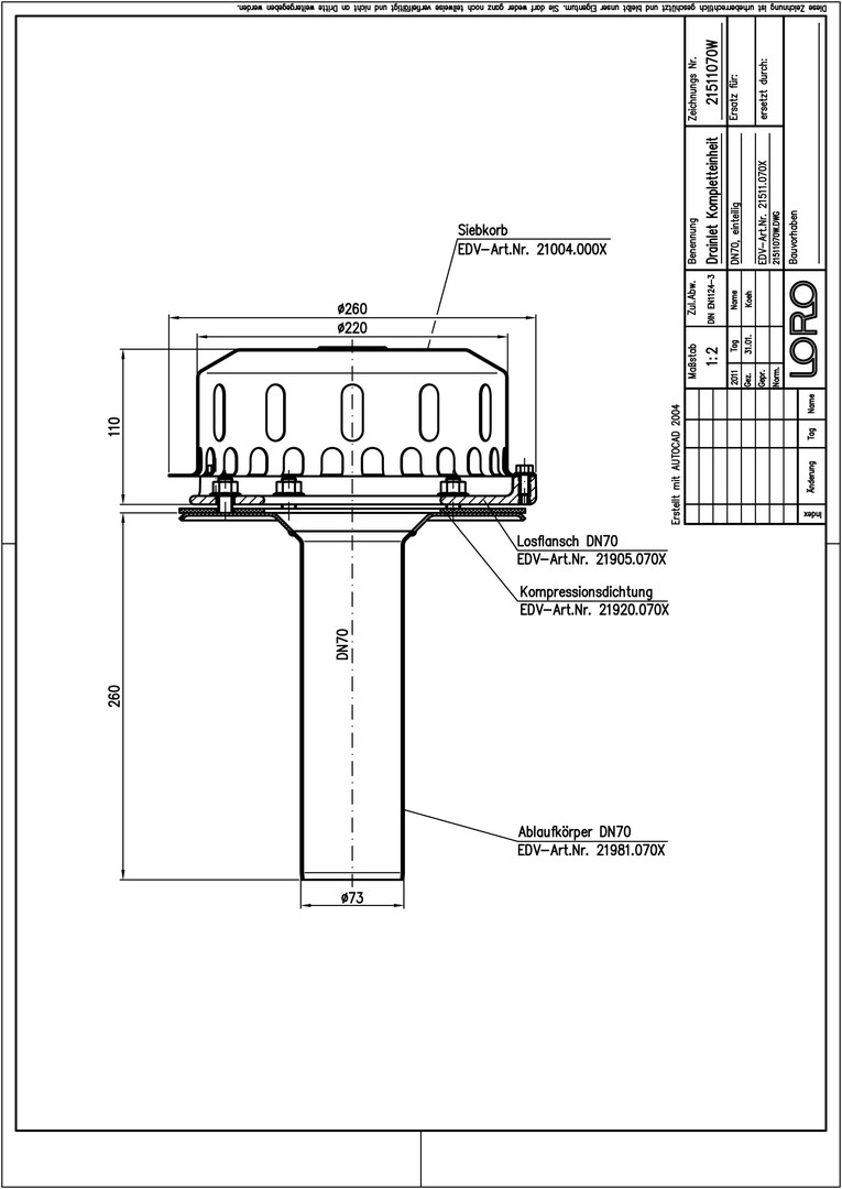 LORO DRAINLET Komplett-Flachdachablauf Serie 84 DN 70, ohne Wärmedämmung, Klemmflansch, Auslauf senkrecht, einteilig, Hauptentwässerung