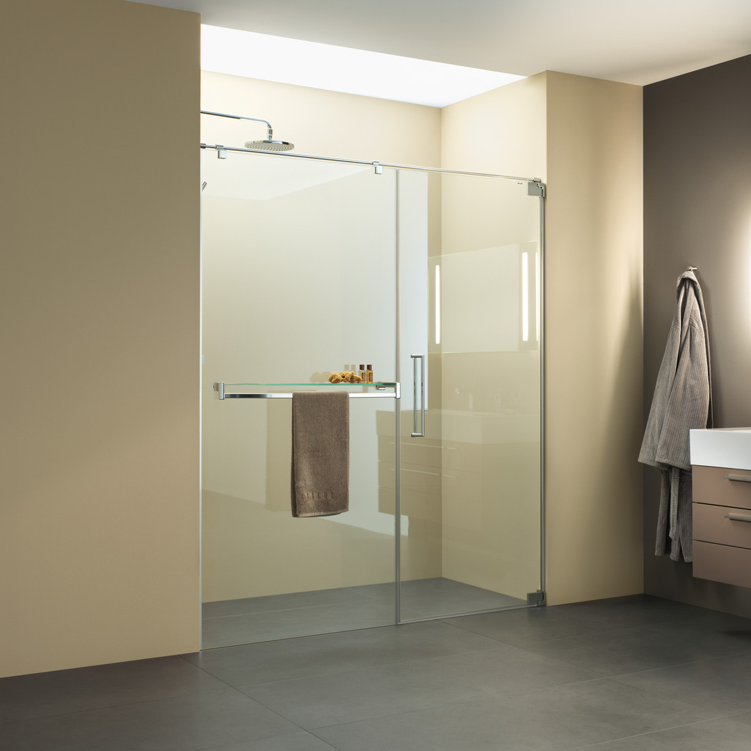 für Nischeneinbau, Glas 8 mm ESG, Standardhöhe 200 cm plus 3 cm Rundrohrbügel Ø 1,4 cm, Tür öffnet nach Innen und Außen, Bodeneben, ohne Schwallschiene, Palm.fix, PALM.lift, PALM.free, PALM.pro, PALM.isi-clean, optional PALM.nano, PALM.care, schmales Wandprofil zur Montage auf oder in Fliese, kostenlose Naturmaßabnahme erforderlich