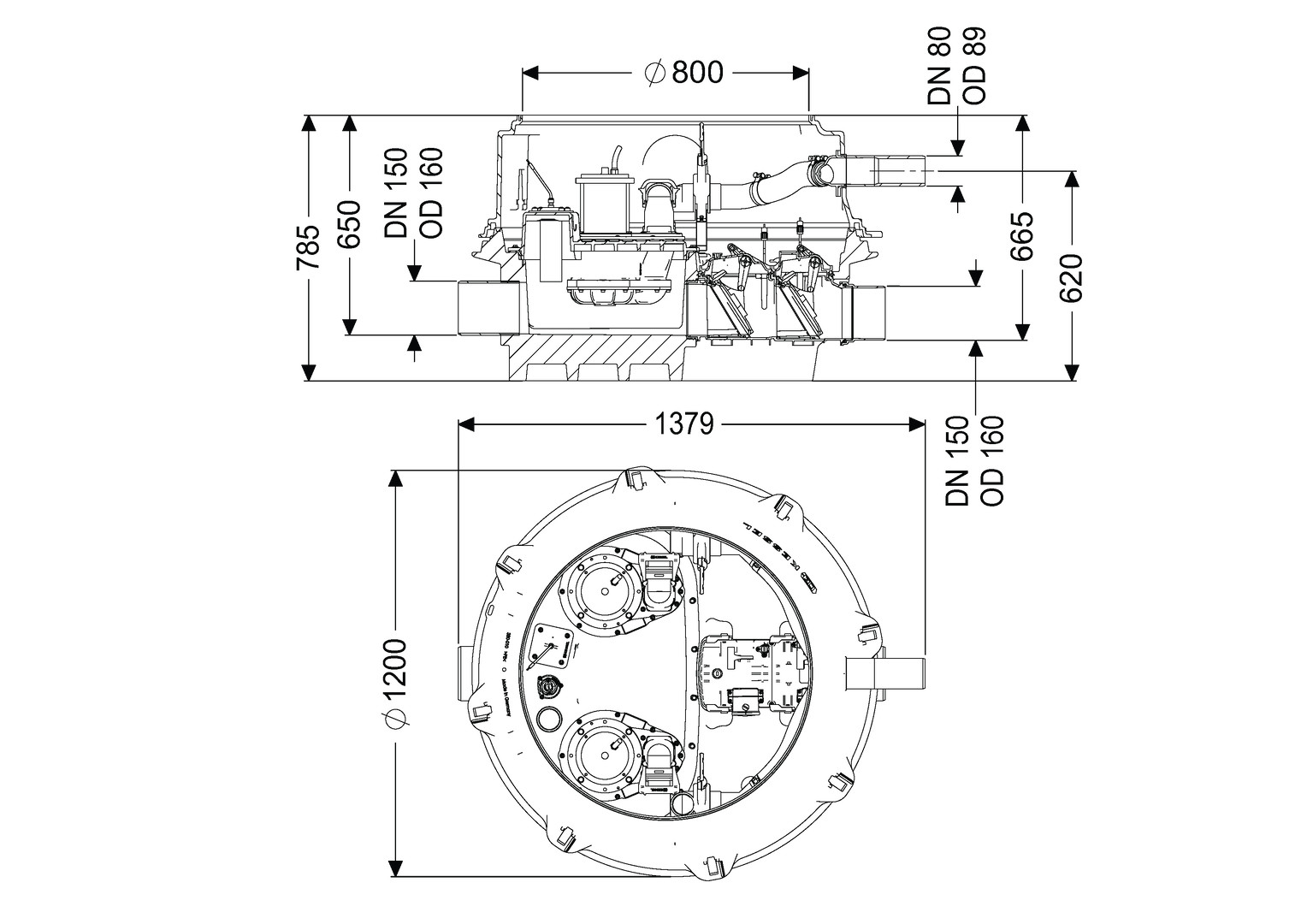 Trockenaufstellung, Variante für niedrigsten Einbau, Bodenteil aus PE, für Einbau in frostgeschützten Räumen (frei aufgestellt) oder in Kombination mit Aufsatzstück LW 800 zum Einbau ins Erdreich oder in eine Bodenplatte, beständig bei Einbau ins Grundwasser bis 3000 mm, die Druckleitung ist als geschweißtes PE-Rohr, bei Pumpe SPF 4500 zusätzlich in einem Druckentspannungsschacht auszuführen, Rückstauhebeanlage Ecolift XL Mono/Duo mit aufgeschweißtem Konus LW 800, Zulauf/Auslauf DN 150, mit Comfort Plus-Schaltgerät, mit einem motorischen Verschlusssystem für Grauwasser oder mit zwei motorischen Verschlusssystemen für Schwarzwasser, 230 V-Versionen steckerfertig, Kabellänge 10 m