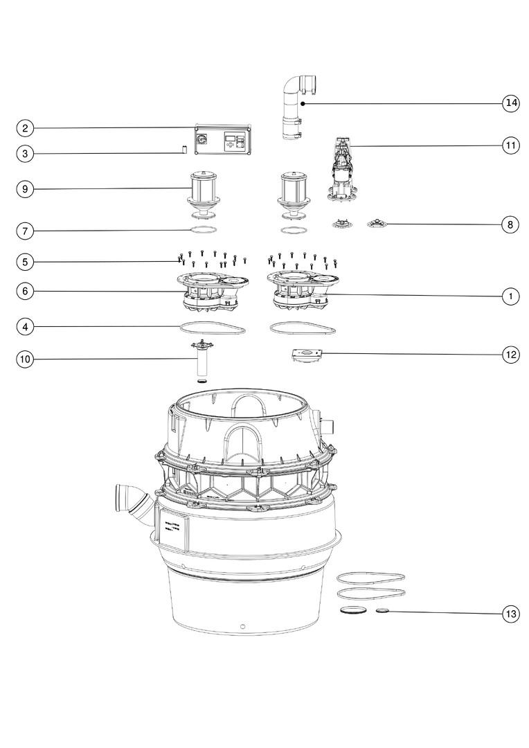 Trockenaufstellung, Variante für niedrigsten Einbau, für fäkalienhaltiges Abwasser, Bodenteil aus PE, Pumpe mit Freistromrad, Einbau in Kombination mit Aufsatzstück LW 800 zum Einbau ins Erdreich oder in eine Bodenplatte, beständig bei Einbau ins Grundwasser bis 3000 mm, die Druckleitung ist als geschweißtes PE-Rohr oder als Klemmverbindung auszuführen, mit Pumpstation Aquapump XL Duo, 230 V-Versionen steckerfertig, aufgeschweißten Konus LW 800, Behältervolumen ca. 335 l, max. Nutzvolumen ca. 160 l, Zulauf DN 150, Druckabgang DN 80, Rückflussverhinderer, Absperreinrichtungen auf Druckleitungsseite, Kabellänge 10 m