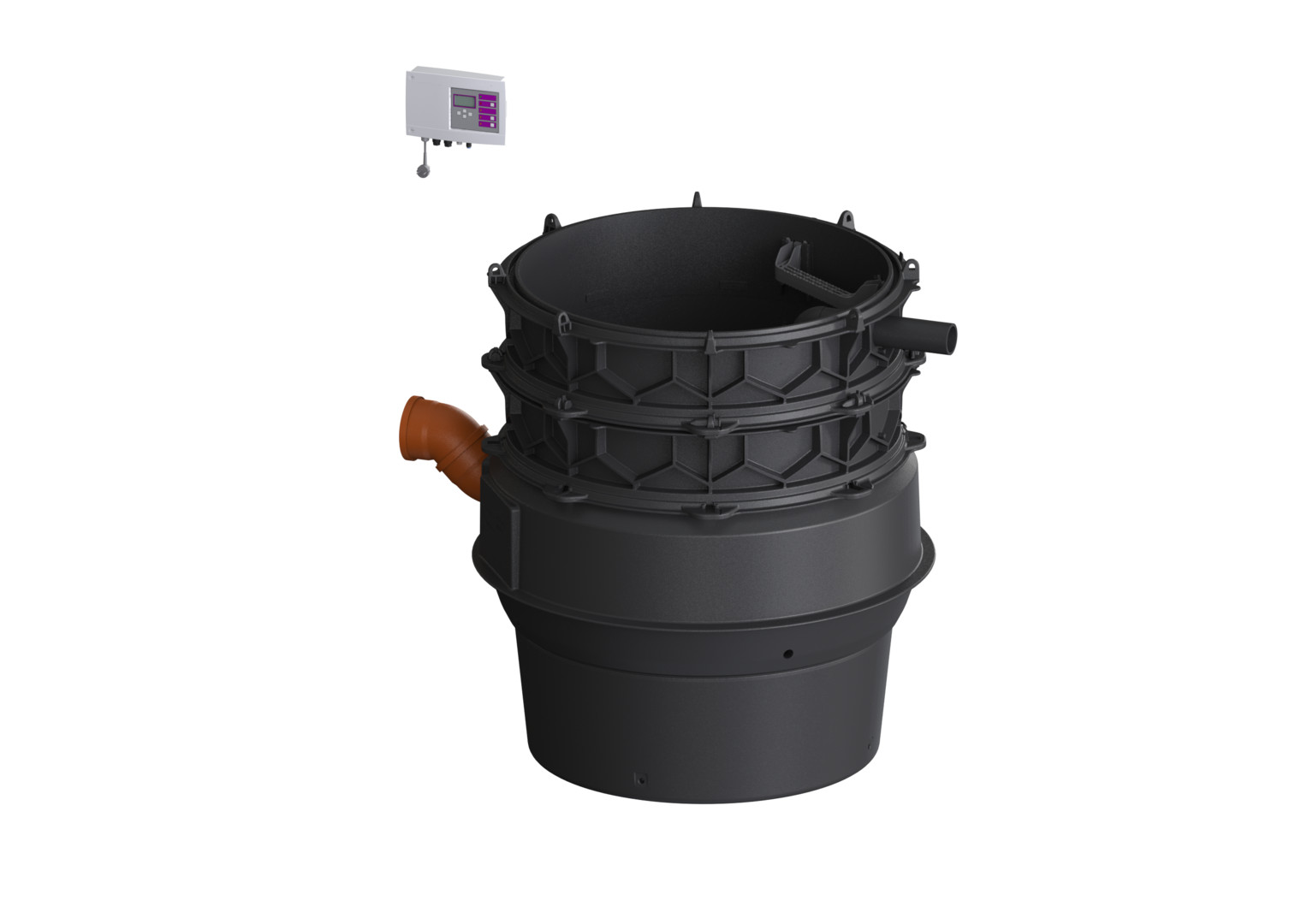 Trockenaufstellung, zum Einbau ins Erdreich oder in eine Bodenplatte, für fäkalienhaltiges Abwasser, Bodenteil aus PE, Pumpe mit Freistromrad, Einbau in Kombination mit Technikschacht-Modul, beständig bei Einbau ins Grundwasser bis 3000 mm, die Druckleitung ist als geschweißtes PE-Rohr oder als Klemmverbindung auszuführen, mit Pumpstation Aquapump XL Duo, 230 V-Versionen steckerfertig, aufgeschweißten Schachtring, Behältervolumen ca. 335 l, max. Nutzvolumen ca. 160 l, Zulauf DN 150, Druckabgang DN 80, Rückflussverhinderer, Absperreinrichtungen auf Druckleitungsseite, Kabellänge 10 m