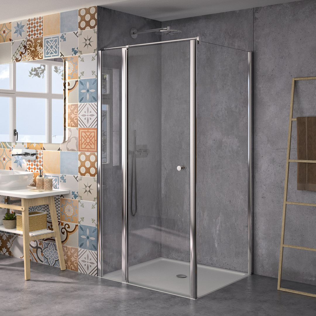Türelement 4 mm ESG transparent, Standardhöhe 2000 mm, Tür öffnet nach innen und außen, optional mit 4 mm hoher Wasserschwallleiste (nicht im Lieferumfang enthalten), PALM.free, PALM.fix, PALM.lift, PALM.invisible, PALM.isi-clean, optional PALM.nano, PALM.care, Fixteil aus 5 mm ESG transparent, mit 45° Wandverstrebung