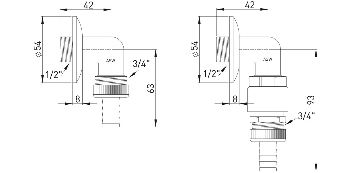 ASW Wandanschlussbogen 1/2" x 3/4", 90°, Messing verchromt, mit Schlauchverschraubung