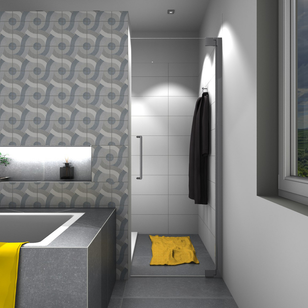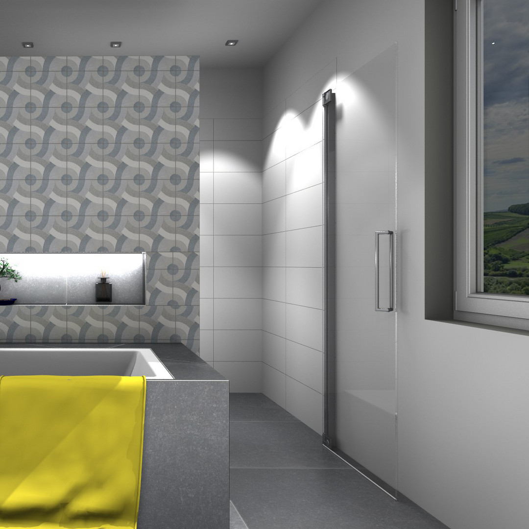 Glas 8 mm ESG, Standardhöhe 200 cm, Tür öffnet nach Innen und Außen, bodeneben, ohne Schwallschiene, PALM.fix, PALM.lift, PALM.free, PALM.isi-clean, optional PALM.nano, PALM.care, durchgehendes Wandbefestigungsprofil mit Verstellbereich