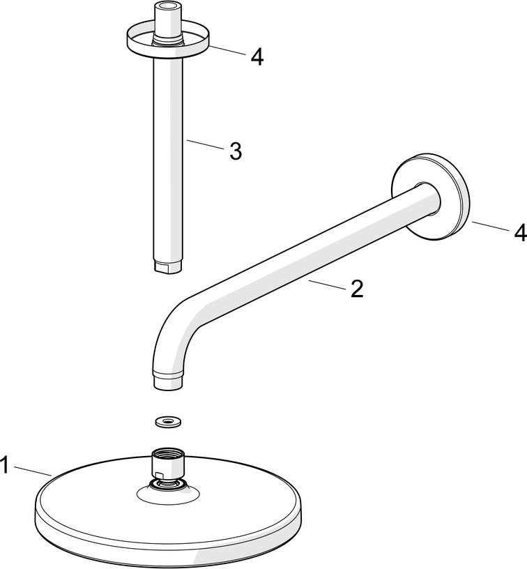 DN 15, Heißwasserversorgung max. 65°C, Arbeitsdruck 1-10 bar, Durchfluss bei 3 bar 15 l/min, Anschlussgröße G1/2, Kopfbrausengröße Ø 200 mm, Ausladung 348 mm, Geräuschklasse I (ISO 3822), Material Verbundwerkstoff, Kopfbrause, schwenkbares Kugelgelenk, Anti-Kalk-Technik, Außengewinde, Abdeckung(en)