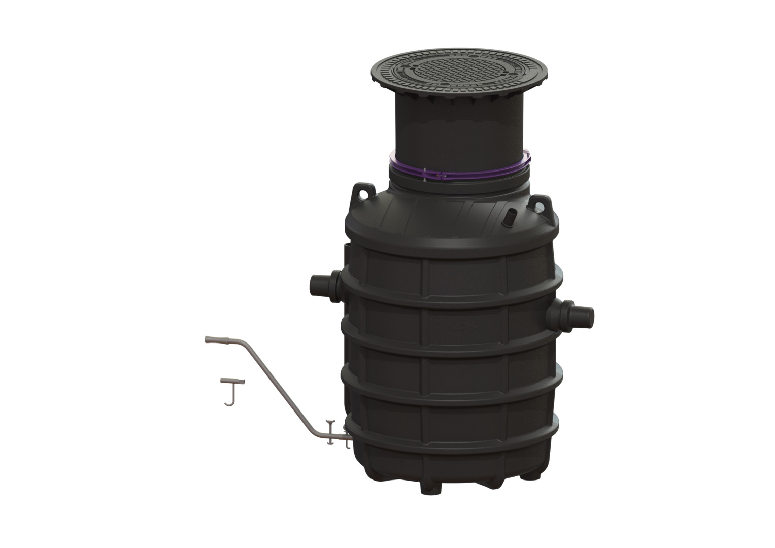 aus Kunststoff, Einbau für frostfreie Tiefe 1200 mm, Einbautiefe 765-1225 mm, grundwasserbeständig bis 500 mm über Behältersohle, teleskopisch höhenverstellbares Aufsatzstück aus Kunststoff, Abdeckung nach DIN EN 124 aus Guss (PKW-/LKW befahrbar), geruchsdicht verschlossen, Aushebeschlüssel, Durchführungsset (NS 4), Anlage komplett montiert, Zubehör Probenahmeeinrichtung, Verlängerungsstück, Hebeanlage, Schichtdicken-Messgerät für Fette, SonicControl