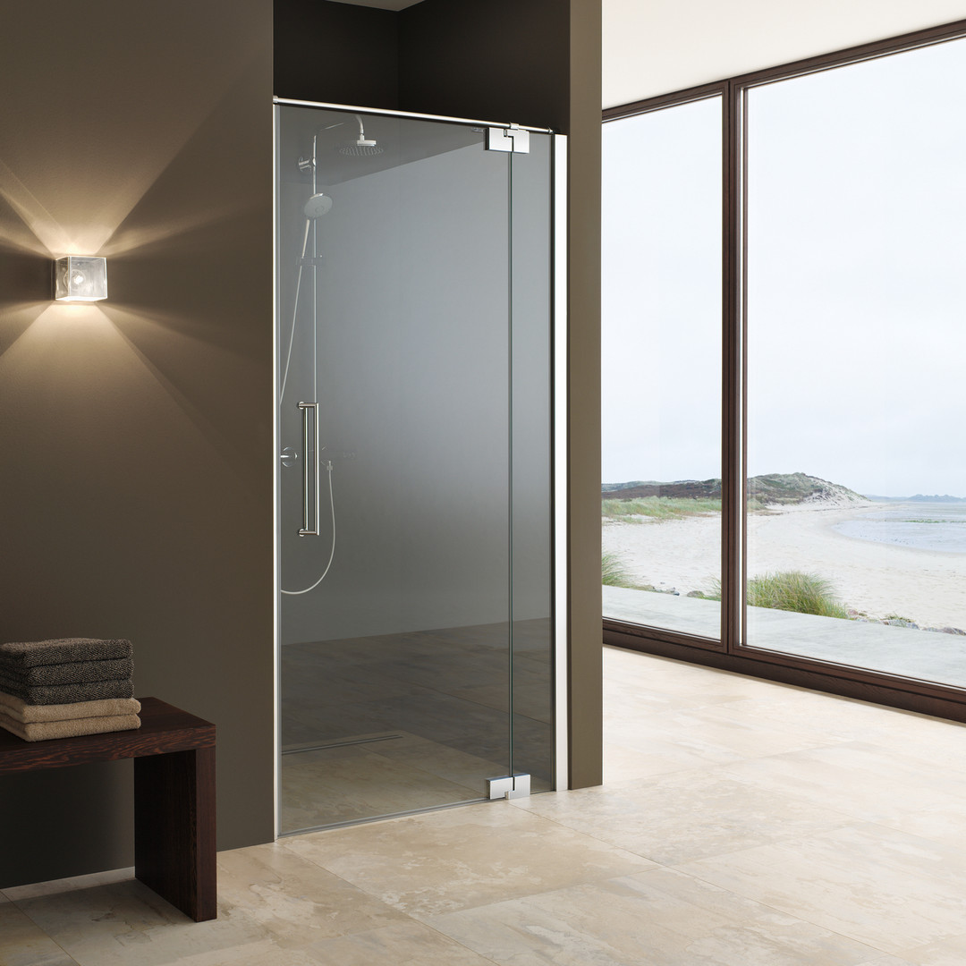 Glas 8 mm ESG, Standardhöhe 200 cm plus 3 cm Rundrohrbügel Ø 1,4 cm, Tür öffnet nach Innen und Außen, bodeneben, ohne Schwallschiene, PALM.fix, PALM.lift, PALM.free, PALM.pro, PALM.isi-clean, optional: PALM.nano, PALM.care, durchgehendes Wandbefestigungsprofil mit Verstellbereich