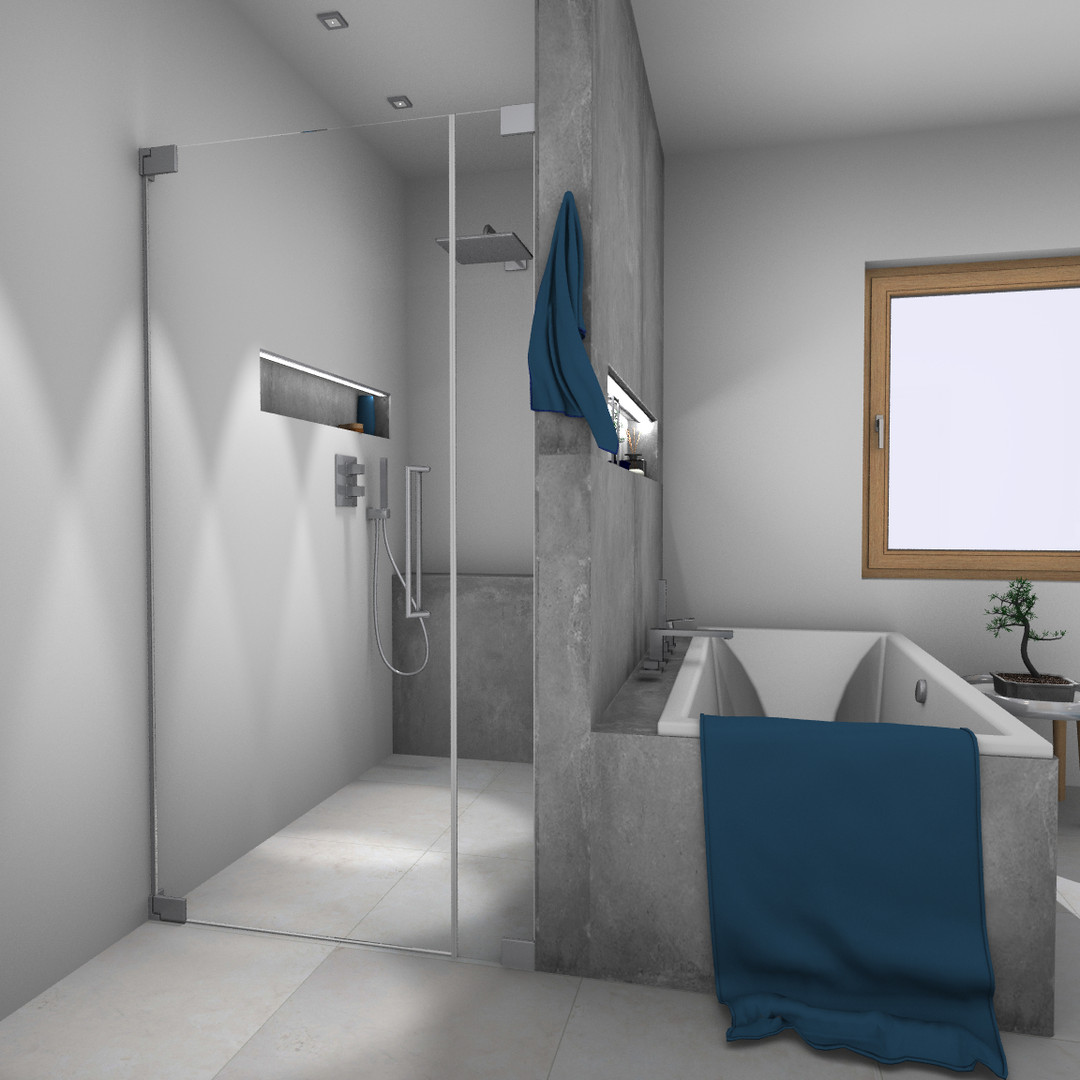 für Nischeneinbau, Glas 8 mm ESG, Standardhöhe 200 cm plus 3 cm Rundrohrbügel Ø 1,4 cm, Tür öffnet nach Innen und Außen, bodeneben, ohne Schwallschiene, Palm.fix, PALM.lift, PALM.free, PALM.pro, PALM.isi-clean, optional PALM.nano, PALM.care, punktuelle Wandbefestigung mittels Beschlägen, kostenlose Naturmaßabnahme erforderlich