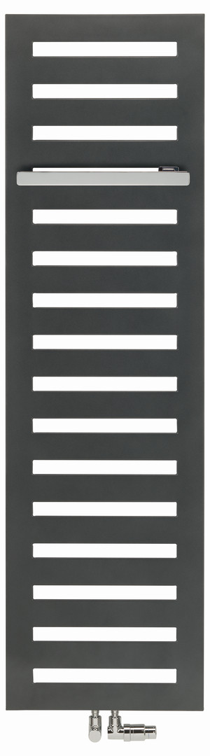 Anschluss für gemischten Betrieb mit eingebautem Heizstab RACY-S, mit Handtuchhalter verchromt, für Einsatz als Bad- und Handtuchheizkörper, flächig wirkender Heizkörper mit eingelassenen Schlitzen, bestehend aus horizontal angeordneten Flachrohren 70 x 8 mm, die mit einem umlaufenden Dreikantprofilrahmen ohne sichtbare Schweißstellen verbunden sind, mit gleichmäßiger Struktur mit Handtuchhalter, Wärmeleistung nach EN 442, Anschlüsse im Mixbetrieb mit RACY-S, Vorlauf/Rücklauf 2x 1/2" unten mittig, Abstand 50 mm und werkseits verdeckt eingebauter Heizstab RACY-S, unten rechts, mit separatem Funksteuergerät Modell 2, Heizkörper mit Pulverlackierung, standardmäßig im Farbton RAL 9016, auf Wunsch in Sonderfarbe, Lieferung montagefertig mit Wandkonsolen, Betriebsüberdruck max. 4 bar, Betriebstemperatur max. 95 °C, individuell positionierbare Design-Handtuchhaken, Ventilintegration auf Wunsch, seitliche Anschlüsse für sauberen Austausch alter DIN Radiatoren auf Wunsch, Montagezubehör in Farbton des Heizkörpers, Elektrobetrieb mit Heizstab RACY-S: im Rahmenprofil unten rechts integrierter Heizstab RACY-S mit separatem, batteriebetriebenem Funksteuergerät Modell 2 zur Bedienung des Heizkörpers, Anschlusskabel mit Konturenstecker in weiß, Schutzart IP 44
