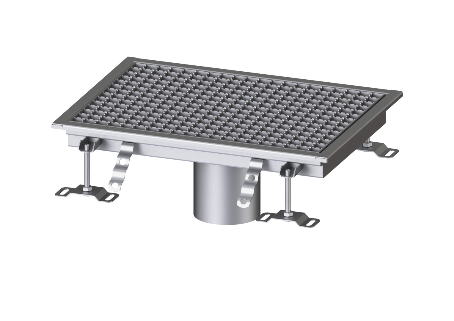 zum Einbau in die Bodenplatte, Material Edelstahl 1.4301 (V2A), Materialstärke 2 mm, im Tauchbad gebeizt, Sichtstege geschliffen, Längs- und Quergefälle, Standfüße zur Höhennivellierung, Auslaufstutzen aus Edelstahl, Abdeckung Gitterrost aus Edelstahl, rutschhemmend R12, im Tauchbad gebeizt, Maschenweite 23 x 23 mm, Belastungsklasse L 15 (1,5 t), optionales Zubehör passende Ablaufgrundkörper System 125, Variofix Ablaufstutzen aus Edelstahl, bis 5 mm radial verschiebbar