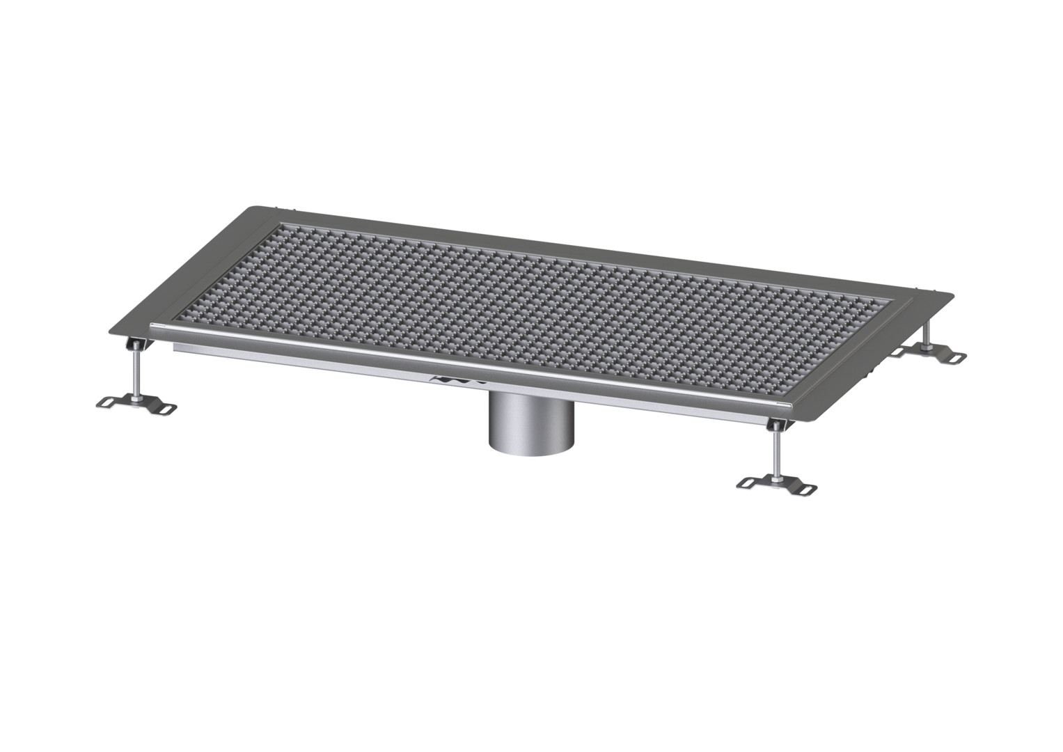 zum Einbau in die Bodenplatte, Materialstärke 1,5 mm, im Tauchbad gebeizt, Sichtstege geschliffen, Längs- und Quergefälle, Standfüße zur Höhennivellierung, Auslaufstutzen aus Edelstahl, Rinnenprofil für Anbindung an Bodenbeschichtungen (z. B. Epoxidharze), mit Kleberand 6 mm tief und 50 mm nach außen abgekantet, umlaufend, mit verschweißten Gehrungen, Abdeckung: Gitterrost aus Edelstahl, rutschhemmend R12, im Tauchbad gebeizt, Maschenweite 23 × 23 mm, Belastungsklasse L 15 (1,5 t), optional als Zubehör passende Ablaufgrundkörper System 125, Variofix Ablaufstutzen aus Edelstahl, bis 5 mm radial verschiebbar