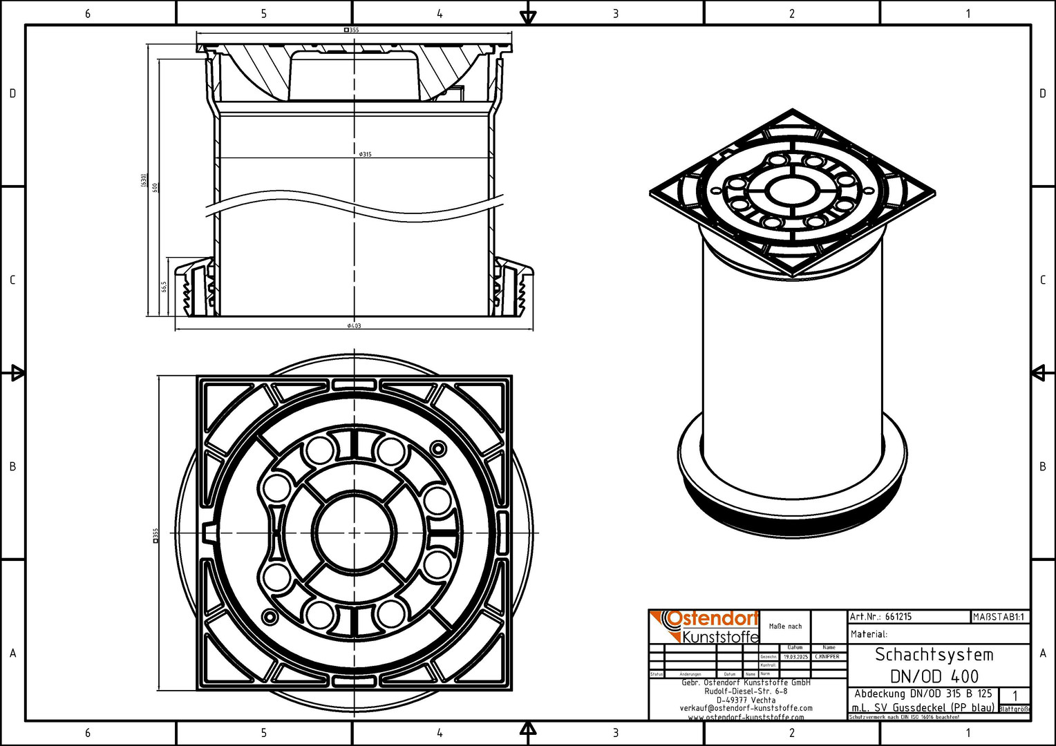 Ostendorf Teleskopabdeckung DN/OD 315, 12,5 t, mit Dichtmanschette/Lüftung, blau