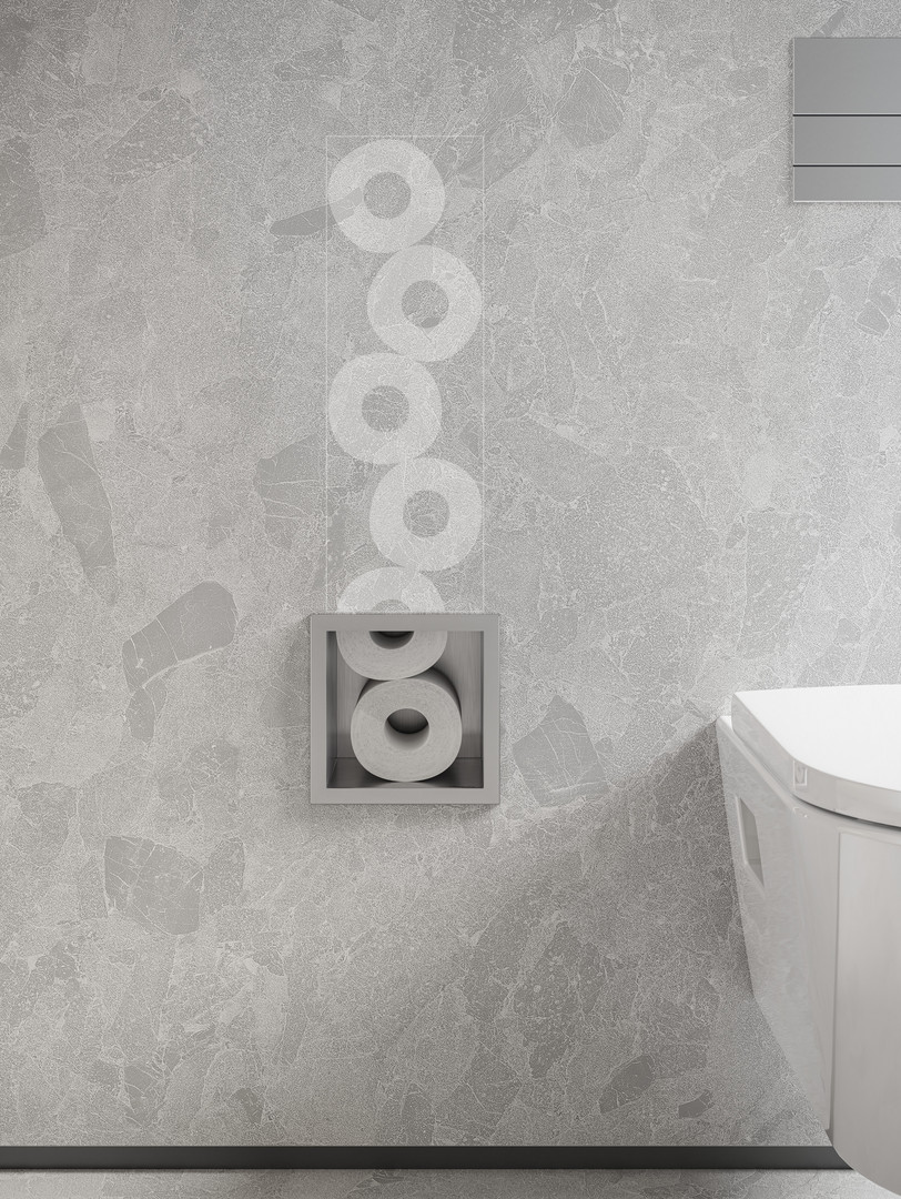 bestehend aus: Wandnische mit Rahmen, Dichtungsset, Installationsset, Anwendungsbereich Neubau, Sanierung, speziell für die Anwendung im Nassbereich, Wandtyp Nassbau, Trockenbau, Dichtungsset Polystyrol (PS), Werkstoffgüte Wandnische Edelstahl V2A (1.4301), benötigte Maße für Dichtungsset 323 x 313 x 75 mm, Vermeidung von Wasserschäden durch wasserdichtes Grundset und vormontiertes Dicht-Vlies