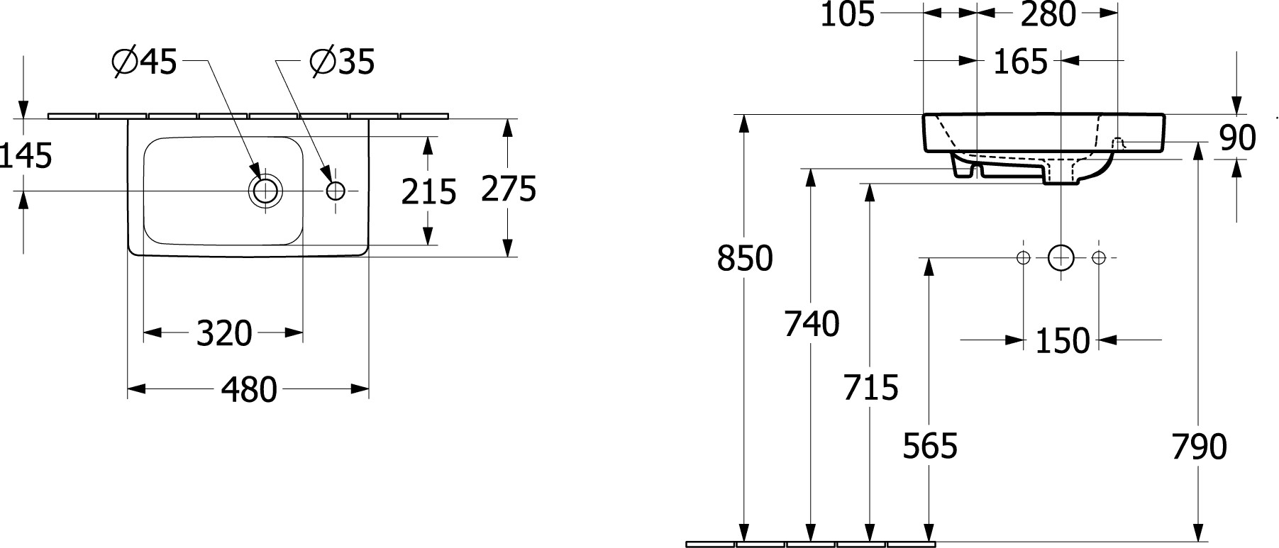 V&B Handwaschbecken Architectura 48x27,5cm, Becken links, 1 Hahnloch, ohne Überlauf, weiß W37690