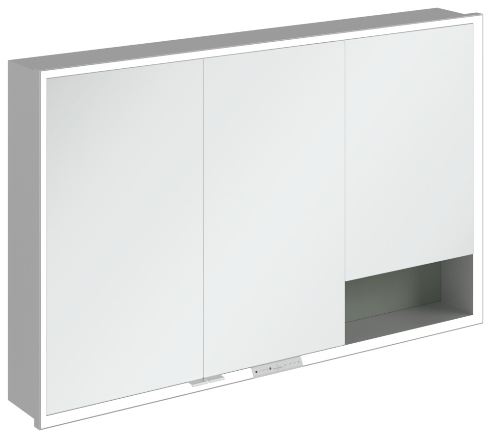 3 x Tür, 1 x Sensorschalter außen, 2 x Steckdose innen, 4 x Ablageboden aus Aluminium, 1 x offenes Fach rechts unten, 1 x Ablageschale, 1 x Vergrößerungsspiegel, 1 x Magnetleiste, IP 44, Montage in der Wand, Einbau, mit Befestigungsset